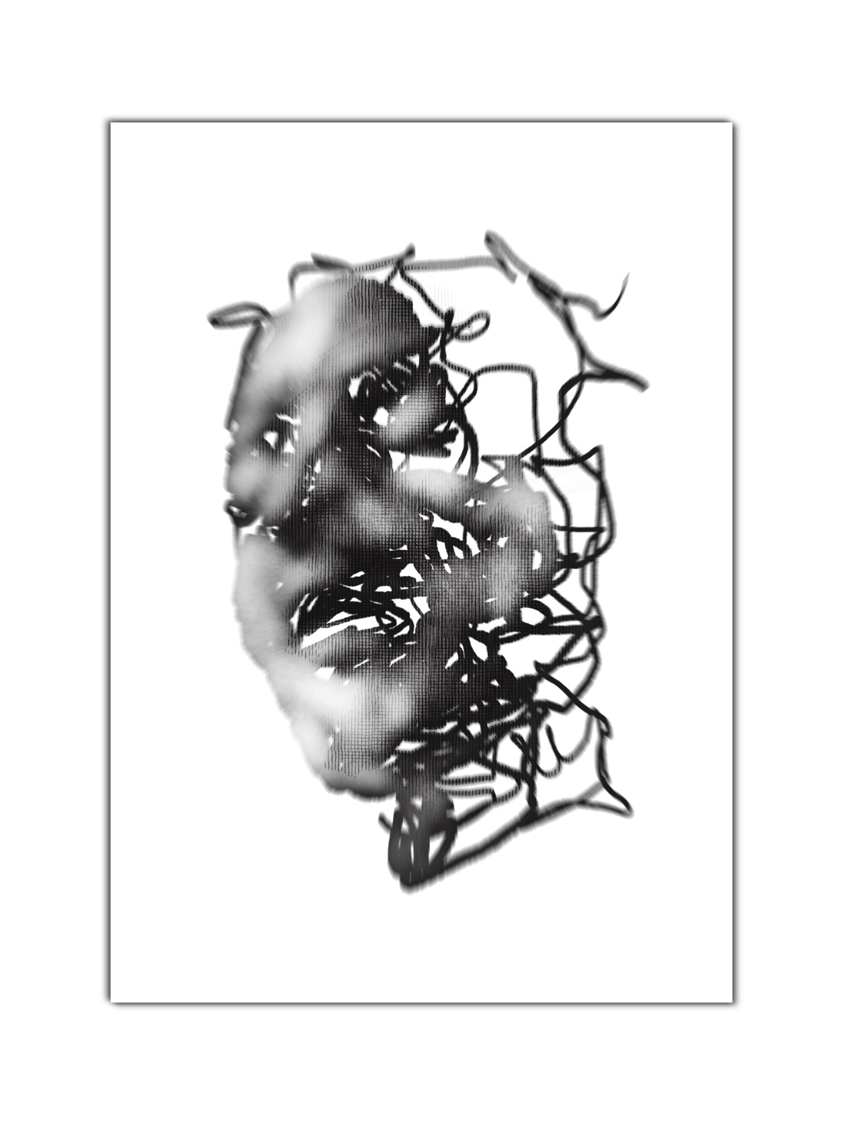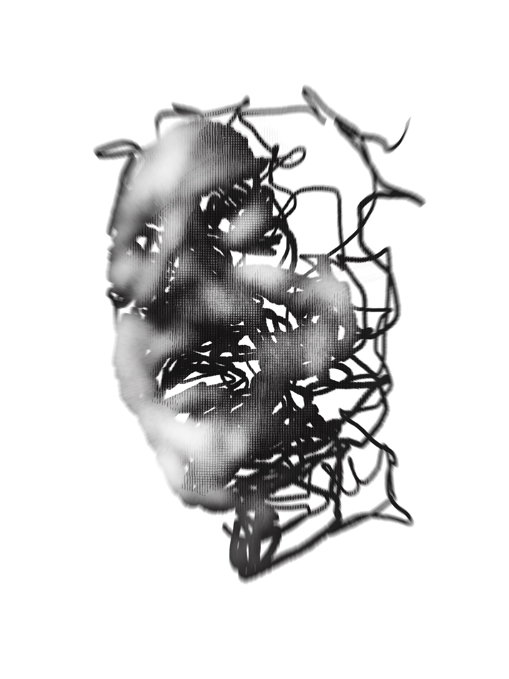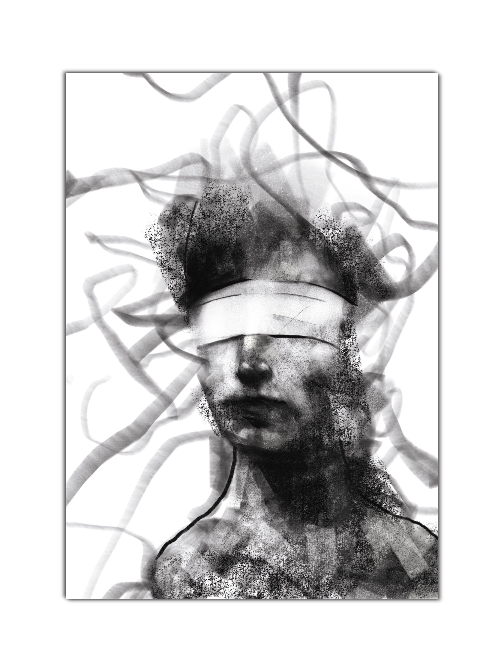 Образ сознания, запутавшегося в собственных линиях, когда шум мыслей не стихает даже в темноте. Повязка — не ограничение, а попытка защиты от внутреннего шторма.