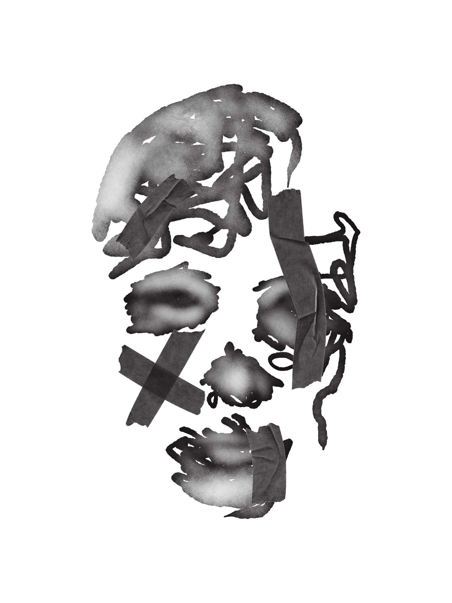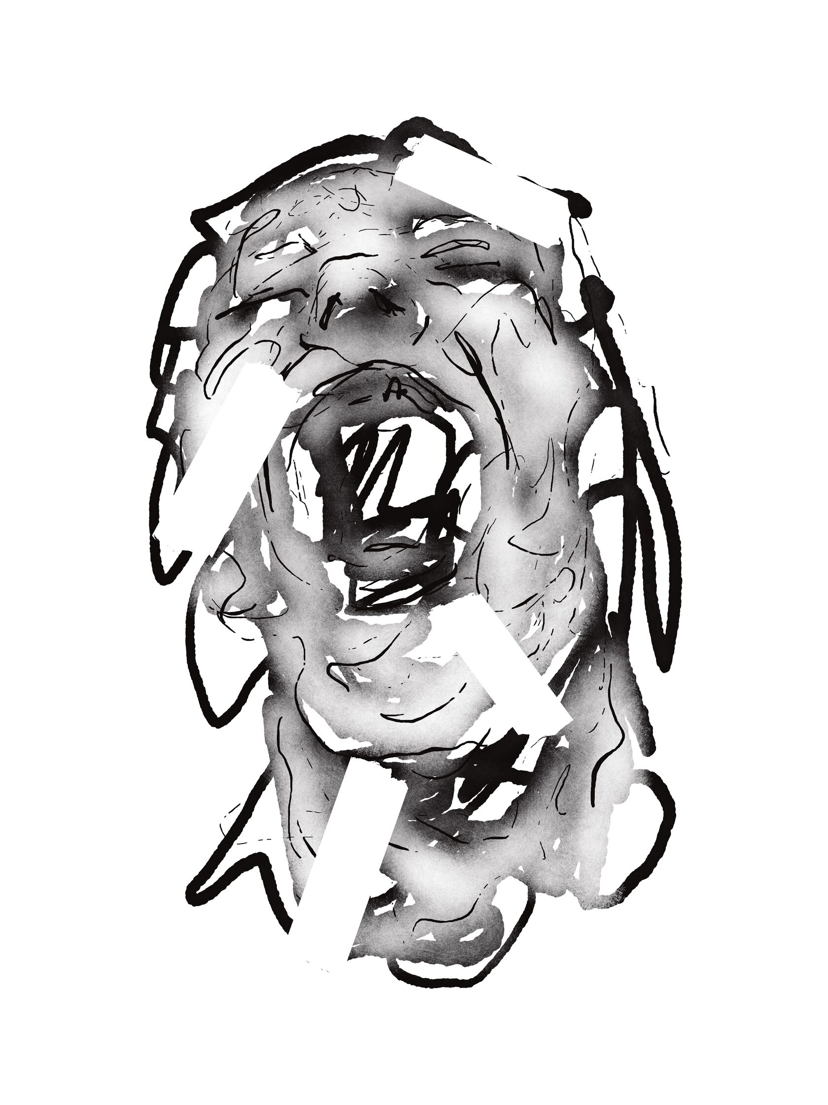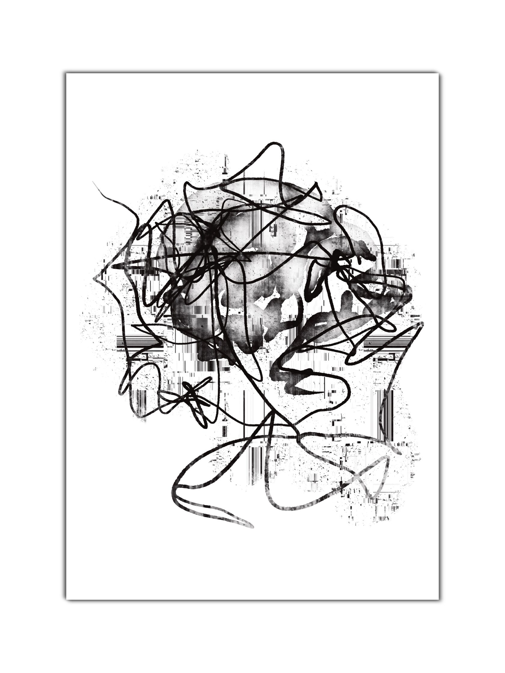 Образ сознания, запутавшегося в собственных линиях, когда шум мыслей не стихает даже в темноте. Повязка — не ограничение, а попытка защиты от внутреннего шторма.